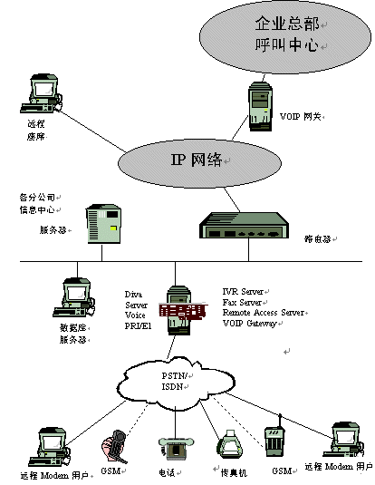 隨著信息技術(shù)的發(fā)展,企業(yè)對通訊的需求越來越多,并越來越呈現(xiàn)多樣性,有語音通訊,傳真通訊,數(shù)據(jù)通訊等。我們拿銀行作為一個例子來分析,目前我國大多數(shù)大型商業(yè)銀行都在各個市(甚至縣)建有一個IVR交互式語音應(yīng)答系統(tǒng)以滿足其客戶的語音查詢需求;同時,系統(tǒng)也要具備傳真通訊功能,以滿足某些大客戶需要傳真回復(fù)確認的需求;目前,各個商業(yè)銀行也建立了自己的企業(yè)銀行平臺,所以中心也需構(gòu)建一個接入服務(wù)器來滿足某些大客戶的遠程撥號接入進行遠程交易;隨著Call center 應(yīng)用的興起,各商業(yè)銀行的省行呼叫中心需要將其各市行的語音接入平臺(IVR),通過VoIP 技術(shù),接入到省行的Call Center 中心,從而建立一個分布式的Call Center,以提高對其客戶服務(wù)的滿意度 。