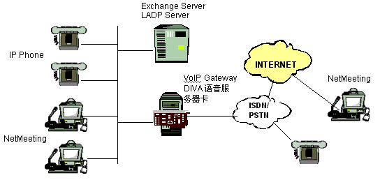當(dāng)然,同樣的方案不僅可以用來(lái)連接兩部電話(huà),而且它還可以用來(lái)將本地的電話(huà)同遠(yuǎn)端的安裝了NetMeeting及麥克風(fēng)和聲卡的PC相連接。