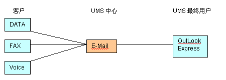 UMS的起源可追溯到數(shù)據(jù),傳真和語(yǔ)音三大應(yīng)用的整合,即統(tǒng)一為E-Mail形式,在企業(yè)內(nèi) 部或INTERNET郵件系統(tǒng)轉(zhuǎn)發(fā)。實(shí)現(xiàn)起來(lái)也較簡(jiǎn)單,如下圖所示: