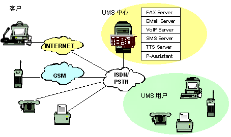 客戶(hù)用電子郵件、語(yǔ)音、尋呼、移動(dòng)短消息、傳真等與UMS用戶(hù)聯(lián)系,UMS中心啟動(dòng)相應(yīng)的服務(wù)與客戶(hù)建立連接,將客戶(hù)所發(fā)信息按識(shí)別標(biāo)識(shí)直接轉(zhuǎn)發(fā)到UMS用戶(hù)或中繼服務(wù)器,若因UMS用戶(hù)不在等原因,無(wú)法直接聯(lián)系,系統(tǒng)會(huì)提示客戶(hù)選擇別的方式聯(lián)系。也可將其存儲(chǔ),并進(jìn)行必要的格式轉(zhuǎn)換與管理,這時(shí)UMS中心可以主動(dòng)呼叫UMS用戶(hù)的手機(jī),傳真機(jī),電話(huà)等主動(dòng)將信息送到,UMS用戶(hù)也可以在任何時(shí)間、任何地點(diǎn),從固定電話(huà)網(wǎng)(普通電話(huà)、傳真機(jī)、IC卡電話(huà)等)、移動(dòng)網(wǎng)(GSM、模擬、CDMA、WAP手機(jī)、掌上電腦、PDA等)、尋呼網(wǎng)、互聯(lián)網(wǎng)(PC)訪(fǎng)問(wèn)中心服務(wù)器查詢(xún),索取個(gè)人信息。