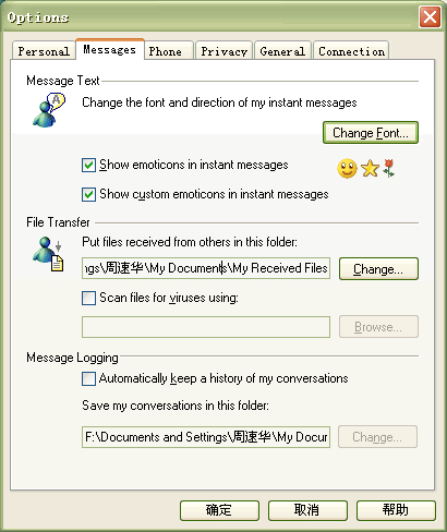 Messenger 6.0必須在個(gè)人選項(xiàng)中進(jìn)行設(shè)置后才可以自動(dòng)保存聊天記錄,默認(rèn)是不支持的。