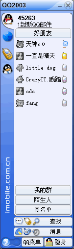 從主界面來(lái)看,MSN Messenger 6.0基本沒(méi)有改變,而QQ2003則新增加了QQ短信和QQ游戲兩個(gè)按紐,同時(shí)增加了QQ郵件提示,這和MSN