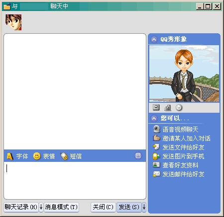 2003的聊天界面也增加了聊天對(duì)象的QQ秀形象的顯示,并且增加了一些常用按鈕,邀請(qǐng)他人參與、發(fā)送文件等。