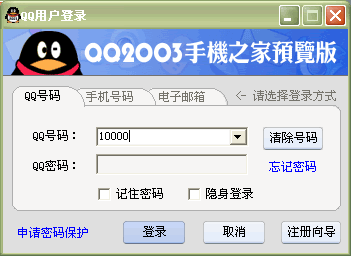 登陸方式在登陸方式上,QQ 2003進(jìn)行大的改變。由于QQ號(hào)碼位數(shù)的增加,有的QQ號(hào)碼已經(jīng)達(dá)到了九位非常難記,QQ 2003則增加手機(jī)號(hào)碼和Email登錄方式,通過(guò)手機(jī)和Email與QQ的綁定,可以輕松的通過(guò)電子郵件和手機(jī)號(hào)碼登陸。MSN