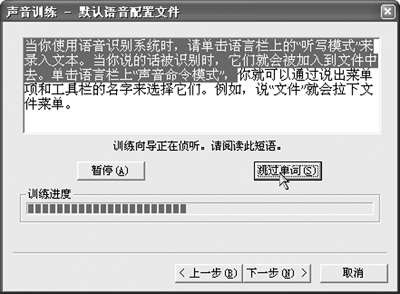 麥克風設(shè)置完成以后,系統(tǒng)會進行語音識別的訓練。首先要求您確認一些聲音基本信息,接著點擊“下一步”,系統(tǒng)給出一個例句,您可以點擊“示例”按鈕聽一聽應(yīng)該如何朗讀這樣的句子。之后,再次點擊“下一步”就可以開始語音訓練了。