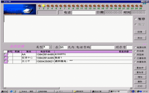 后臺(tái)主要完成對(duì)短信息的收發(fā),包括群收、群發(fā)的處理,還有生日祝福、定時(shí)發(fā)送、短信中心號(hào)碼的設(shè)置等(參見(jiàn)使用說(shuō)明書(shū)),即完成與廣播平臺(tái)無(wú)關(guān)的一些處理。