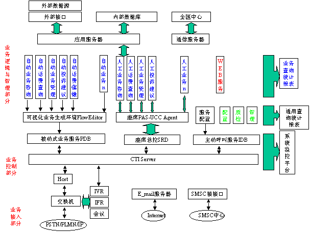 平臺(tái)部分完成系統(tǒng)的基本服務(wù)處理,不針對(duì)具體的服務(wù)業(yè)務(wù),提供電話接入、呼叫控制、人工/自動(dòng)服務(wù)、e_mail服務(wù)、WEB服務(wù)、SMSC服務(wù)等的基礎(chǔ)環(huán)境。業(yè)務(wù)部分完成系統(tǒng)的業(yè)務(wù)描述,按照平臺(tái)的業(yè)務(wù)接口,針對(duì)聯(lián)通1001客戶服務(wù)的每一個(gè)具體業(yè)務(wù)需要,開發(fā)相應(yīng)的服務(wù)業(yè)務(wù)功能模塊或流程,實(shí)現(xiàn)系統(tǒng)的服務(wù)業(yè)務(wù)。業(yè)務(wù)部分完全建立在PAS-UCC平臺(tái)之上。