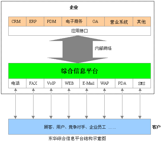 東華集團(tuán)綜合信息平臺(tái)不但能完善服務(wù)質(zhì)量、提高客戶滿意度;可以降低服務(wù)及業(yè)務(wù)處理運(yùn)營成本,提高勞動(dòng)生產(chǎn)率,充分利用資源;更能適應(yīng)業(yè)務(wù)的迅猛發(fā)展,擴(kuò)展業(yè)務(wù)處理能力,增加業(yè)務(wù)收入,是企業(yè)進(jìn)行客戶關(guān)系管理的完全解決方案,是企業(yè)構(gòu)建CRM的基礎(chǔ)。