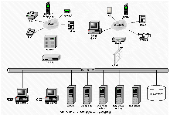普通電話用戶通過PSTN接入DHC- UIPS綜合信息平臺(tái)系統(tǒng),接受話務(wù)員服務(wù)或自動(dòng)業(yè)務(wù)流程。傳真用戶進(jìn)入系統(tǒng)可以進(jìn)行傳真業(yè)務(wù)。計(jì)算機(jī)用戶也可以通過Internet訪問企業(yè)客戶服務(wù)系統(tǒng)主頁,獲得服務(wù)。同時(shí)計(jì)算機(jī)用戶也可以通過Internet利用網(wǎng)絡(luò)電話的功能要求話務(wù)員服務(wù)或自動(dòng)業(yè)務(wù)流程。
