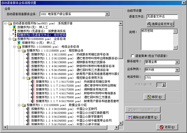 。。智能業(yè)務管理系統(tǒng)是Utron-CC2000進行業(yè)務擴充的主要手段。用戶如需擴展新的業(yè)務,主要通過智能業(yè)務管理系統(tǒng)向Utron-CC2000注冊該業(yè)務;并為系統(tǒng)中的座席分配業(yè)務。根據(jù)實際業(yè)務的需求,生成相應的系統(tǒng)信箱、業(yè)務腳本、服務項目等,來實現(xiàn)新業(yè)務的動態(tài)加載。