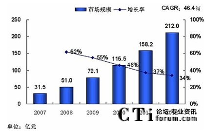 再來看看統(tǒng)一市場的前景,下圖是某咨詢公司對國內(nèi)統(tǒng)一通信市場的預測數(shù)據(jù),2012年將達到212億元,盡管可能存在一定水份,但這么多公司介入這個市場,本身就體現(xiàn)了發(fā)展?jié)摿,這點不容懷疑。