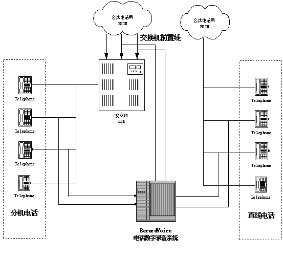 語音卡的模擬線接口和排隊機/交換機的模擬中繼并聯,錄音工作站主要針對外線話音進行錄音。