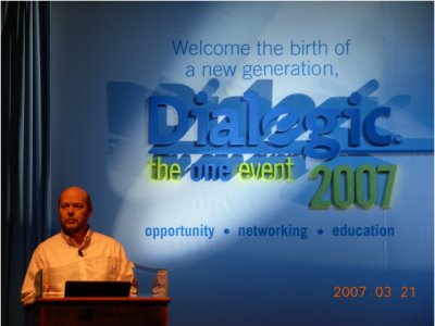 大會(huì)首先由Dialogic公司的全球資深副總裁 James Besley致辭!拔覀兓貋砹耍 ,James一句意味深長(zhǎng)的開場(chǎng)白引來了全場(chǎng)長(zhǎng)時(shí)間的熱烈鼓掌。是的,曾幾何時(shí),Dialogic在全球CTI領(lǐng)域是何等的輝煌,上個(gè)世紀(jì)九十年代他們?nèi)〉眠^驕人的業(yè)績(jī),占據(jù)了全球市場(chǎng)的絕大部分份額,稱之為當(dāng)時(shí)CTI行業(yè)的先驅(qū)和領(lǐng)導(dǎo)者實(shí)不為過。