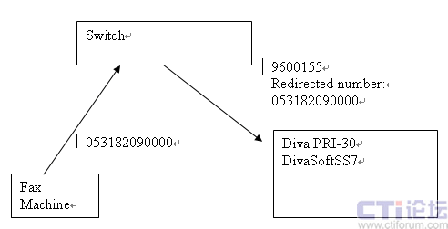 Dialogic Diva SS7傳真解決方案簡介:以往的傳真運營在處理接收傳真的時候都是通過提供一個接入平臺號(例如山東網(wǎng)通的商務(wù)新動力為9600155),然后通過語音提示輸入傳真信箱號。這樣做的缺點在于對于所有的客戶來說接入號碼都是統(tǒng)一的,不能滿足個性化需求。有一些客戶不想失去原有的傳真機號碼。希望網(wǎng)絡(luò)傳真系統(tǒng)能夠綁定他們原來的傳真?zhèn)髡鏅C號碼。例如某客戶原有的號碼是053182090000,通過號碼綁定,當其他用戶向他發(fā)傳真的時候,撥打的號碼是053182090000,但是此呼叫會被呼轉(zhuǎn)到9600155。傳真平臺根據(jù)原始被叫號來接收傳真。原有的基于PRI的解決方案不能解決原始被叫號的傳送問題,所以必須借助SS7網(wǎng)絡(luò)才能實現(xiàn)?蛻魮艽053182090000,呼叫被呼轉(zhuǎn)到9600155.在Redirected