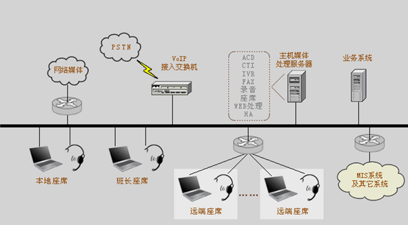 對(duì)于那些地區(qū)分布廣泛,而又要集中管理的單位,可在各個(gè)局部地區(qū)設(shè)置遠(yuǎn)端座席,并通過(guò)網(wǎng)絡(luò)方便的接入中心系統(tǒng)。系統(tǒng)為遠(yuǎn)端座席提供與中心座席完全相同的操作,遠(yuǎn)端座席可以根據(jù)各個(gè)地區(qū)的特定情況有針對(duì)性的處理各個(gè)局部地區(qū)的業(yè)務(wù),為中心分流壓力,同時(shí)中心系統(tǒng)也可以完全掌握遠(yuǎn)端座席的情況。