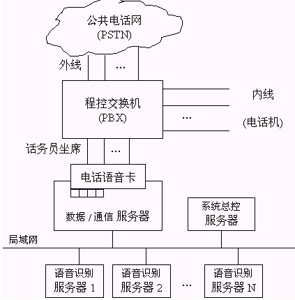 這是一個易擴(kuò)展的系統(tǒng)結(jié)構(gòu)。當(dāng)話務(wù)員坐席規(guī)模較大時,系統(tǒng)可增加多臺識別服務(wù)器并立即生效而不需進(jìn)行特殊的配置,當(dāng)話務(wù)員坐席規(guī)模較小時,上述各個"邏輯"的軟件服務(wù)器可運(yùn)行在同一臺"物理"的機(jī)器上,從而在保證整體系統(tǒng)性能的前提下,降低硬件的成本。