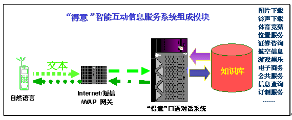 "得意口語對話系統(tǒng)"可以充分滿足互聯(lián)網(wǎng)、短信、WAP等業(yè)務(wù)的智能互動信息服務(wù)需求,為SP和用戶提供了更易用、好用、實(shí)用的信息交流平臺。