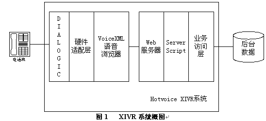 采用Hotvoice XIVR系統(tǒng)實現(xiàn)的新業(yè)務可以采用任何Web技術方便地和原有數據系統(tǒng)結合。用戶可以根據業(yè)務需求編寫靜態(tài)voiceXML腳本,或采用ASP/JSP/PHP等動態(tài)生成voiceXML腳本;與后臺數據系統(tǒng)間可以采用數據庫訪問,或采用XML/HTTP/DCOM或其他協(xié)議訪問。