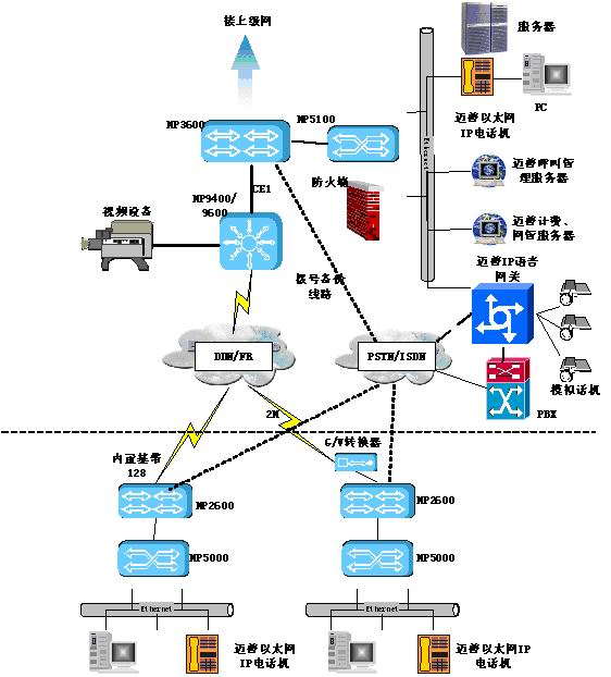 目前許多公安系統(tǒng)雖然采用具有IP語音功能的路由設備組建網(wǎng)絡,但在業(yè)務語音交流通常還通過PBX集團交換機走電信PSTN/ISDN電話網(wǎng),這樣無法節(jié)省電話費用,反而增加了辦公費用。邁普IP語音解決方案采用了邁普MyPower VG2000IP語音網(wǎng)關和邁普以太網(wǎng)IP電話進行改造。在整個網(wǎng)點語音終端全部設備選用經(jīng)濟型邁普以太網(wǎng)IP電話機,它采用雙以太口設計,使網(wǎng)絡無需重新布線,同時也可使用已有的路由器上IP語音模塊;邁普以太網(wǎng)IP電話機之間的話音通信通過邁普呼叫管理服務器集中控制。在主體IP網(wǎng)絡中,邁普IP語音網(wǎng)關放置于中心機房作為傳統(tǒng)PSTN的出口,可以通過VOS接口、E1接口(中國一號信令)、E&M接口等多種方式接入公安PBX,將PSTN線路傳來的時分話音或傳真信息進行分組和壓縮,轉(zhuǎn)換成IP數(shù)據(jù)包,通過路由設備路由到目的地;在沒有PBX的公安機房,邁普IP語音網(wǎng)關可以提供32路的模擬用戶接口,可以完全替代傳統(tǒng)PBX并接入PSTN,并提供額外功能,如圖中虛線所示;整個方案還可以針對公安用戶特殊需求"定做"特色功能,例如緊急告警等方便日常辦公。