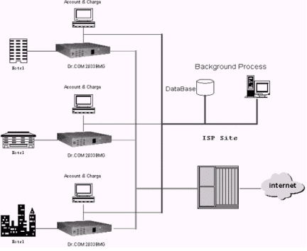 由Dr.COM Enterprise IP Billingware 計(jì)費(fèi)軟件與RAS-2188或2033BMG接入服務(wù)器硬件構(gòu)成的是一套完整的酒店上網(wǎng)計(jì)費(fèi)管理系統(tǒng)。為了最大限度地兼容現(xiàn)有的酒店管理系統(tǒng),它可設(shè)計(jì)成可拆分的功能模塊: