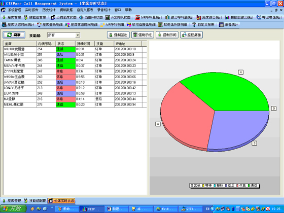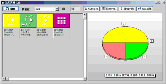 當(dāng)前座席狀態(tài):能夠提供座席的狀態(tài)表示,狀態(tài)持續(xù)時間,對應(yīng)的技能組,對應(yīng)的分機號碼,對應(yīng)的IP地址等信息。可以對任何一個座席進行強制簽出、強制示忙、強制示閑操作。可以對任意座席進行屏幕監(jiān)控操作(無需任何第三方軟件)。