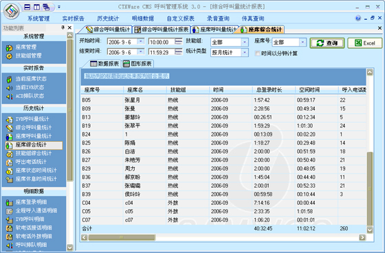 座席綜合統(tǒng)計:可以根據(jù)“月份”、“天”、“小時”來統(tǒng)計每一個座席的綜合指標(biāo)。統(tǒng)計的指標(biāo)包括:總登錄時長、空閑時長、呼入電話數(shù)、呼入時長、平均呼入時長、呼出電話數(shù)、呼出時長、平均呼出時長、通話總數(shù)、通話總時長、后處理時長、平均后處理時長、AUX總時長、電話振鈴時長、平均振鈴時長、轉(zhuǎn)移次數(shù)、磋商次數(shù)、保持次數(shù)、平均保持時長。