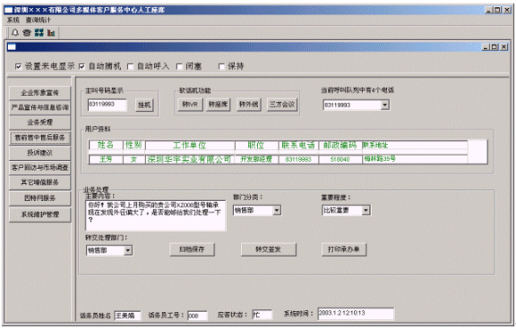 ◇提高企業(yè)親切感:系統(tǒng)在人工服務(wù)狀態(tài)下,當業(yè)務(wù)代表輸入客戶名稱時,系統(tǒng)即時將客戶與企業(yè)相關(guān)的信息顯示在座席終端上,使業(yè)務(wù)及時了解客戶,有針對性回答客戶問題,使客戶倍感親切。