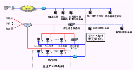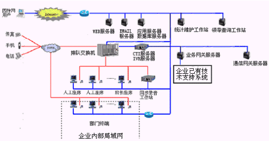 本系統(tǒng)物理結(jié)構(gòu)由帶語音板卡的工控機或排隊交換機、CTI服務(wù)器、IVR(交互式語音應(yīng)答)/IFR(交互式傳真應(yīng)答)服務(wù)器、業(yè)務(wù)代表座席(邏輯上分為:普通業(yè)務(wù)代表座席、專家座席等)、班長座席、統(tǒng)計維護管理工作站、因特網(wǎng)(WEB)服務(wù)器、電子郵件(EMAIL)服務(wù)器、數(shù)據(jù)庫/應(yīng)用服務(wù)器、錄音留言工作站、領(lǐng)導(dǎo)查詢工作站、業(yè)務(wù)網(wǎng)關(guān)服務(wù)器、通信網(wǎng)關(guān)、網(wǎng)絡(luò)系統(tǒng)等構(gòu)成。