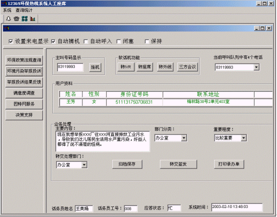該系統(tǒng)利用環(huán)保局現(xiàn)有的信息網(wǎng)絡(luò)資源,將自動語音查詢、人工服務(wù)、信息資料處理緊密結(jié)合起來,為人民群眾提供全天候24小時不間斷的優(yōu)質(zhì)服務(wù)。