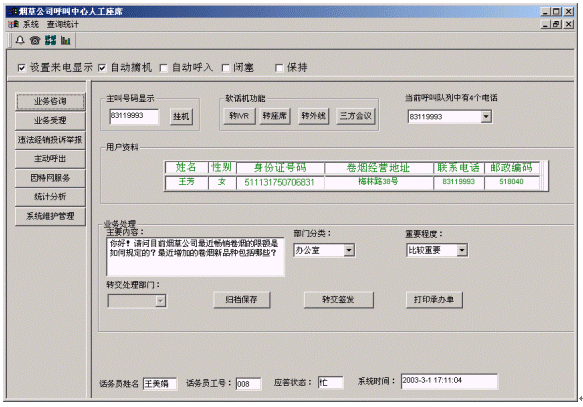煙草公司呼叫中心將接入功能、導(dǎo)航功能、自動語音查詢功能、人工座席服務(wù)功能、話路轉(zhuǎn)接功能、信息資料處理緊密聯(lián)系起來。用戶撥打特服電話號碼后,可以根據(jù)需要選擇人工服務(wù)、自動語音查詢、自動留言,并能夠在幾種服務(wù)中來回切換或轉(zhuǎn)接其它電話;所記錄的資料可以分門別類的進行統(tǒng)計并形成報表,供相關(guān)部門進行檢索查閱;意見處理完畢,可由座席主動呼叫用戶,告知處理意見,形成閉環(huán)處理流程。