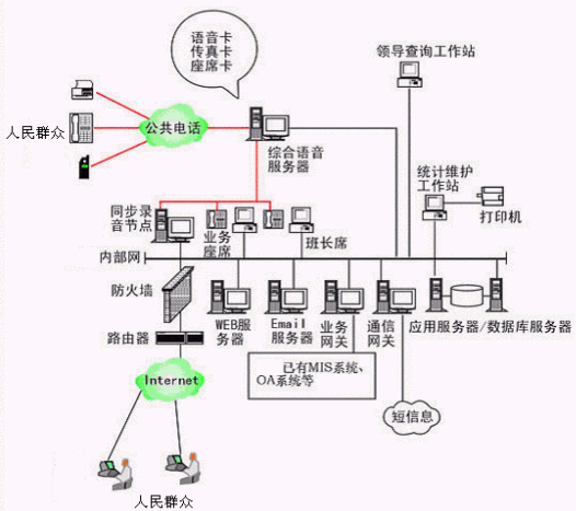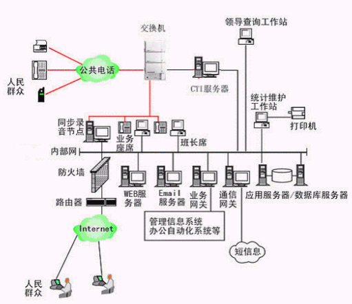 本系統(tǒng)物理結(jié)構(gòu)由排隊(duì)交換機(jī)、CTI服務(wù)器、IVR(交互式語音應(yīng)答)/IFR(交互式傳真應(yīng)答)服務(wù)器、業(yè)務(wù)代表座席(邏輯上分為:普通業(yè)務(wù)代表座席、專家座席、WEB座席等)、班長座席、統(tǒng)計維護(hù)管理工作站、因特網(wǎng)(WEB)服務(wù)器、電子郵件(EMAIL)服務(wù)器、數(shù)據(jù)庫/應(yīng)用服務(wù)器、錄音留言工作站、領(lǐng)導(dǎo)查詢工作站、業(yè)務(wù)網(wǎng)關(guān)服務(wù)器、通信網(wǎng)關(guān)、網(wǎng)絡(luò)系統(tǒng)等和應(yīng)用軟件構(gòu)成。