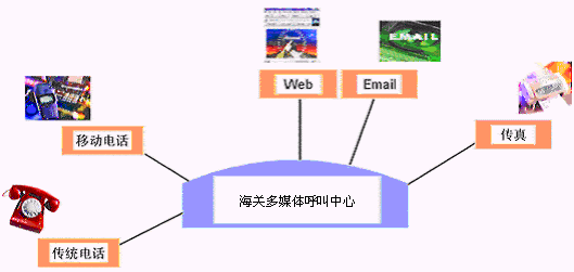 客戶(hù)利用電話、傳真、電子郵件、因特網(wǎng)、手機(jī)等撥打某一特服號(hào)碼(如9xxxx)進(jìn)入海關(guān)多媒體呼叫中心系統(tǒng),本系統(tǒng)依托海關(guān)緝私相關(guān)的MIS系統(tǒng)、OA度系統(tǒng)等各類(lèi)業(yè)務(wù)技術(shù)支持系統(tǒng)和網(wǎng)絡(luò)系統(tǒng),通過(guò)自動(dòng)語(yǔ)音服務(wù)或人工受理等方式全天24小時(shí)不間斷地為客戶(hù)提供各種服務(wù)。