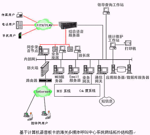 本多媒體呼叫中心的物理結(jié)構(gòu)由帶語(yǔ)音板卡的高工控機(jī)、CTI服務(wù)器、IVR(交互式語(yǔ)音應(yīng)答)/IFR(交互式傳真應(yīng)答)服務(wù)器、業(yè)務(wù)代表座席(邏輯上分為:普通業(yè)務(wù)代表座席、專(zhuān)家座席、WEB座席等)、班長(zhǎng)座席/質(zhì)檢座席、統(tǒng)計(jì)維護(hù)管理工作站、因特網(wǎng)(WEB)服務(wù)器、電子郵件(EMAIL)服務(wù)器、數(shù)據(jù)庫(kù)/應(yīng)用服務(wù)器、錄音留言工作站、領(lǐng)導(dǎo)查詢(xún)工作站、業(yè)務(wù)網(wǎng)關(guān)服務(wù)器、通信網(wǎng)關(guān)服務(wù)器、網(wǎng)絡(luò)系統(tǒng)等和應(yīng)用軟件構(gòu)成。