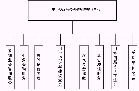 客戶利用電話、手機(jī)等撥打某一特服號碼(如9xxxx)進(jìn)入中小型煤氣公司多媒體呼叫中心系統(tǒng),本系統(tǒng)依托煤氣公司各類業(yè)務(wù)技術(shù)支持系統(tǒng)和網(wǎng)絡(luò)系統(tǒng),通過人工受理或自動語音服務(wù)等方式全天24小時不間斷地為客戶提供各種服務(wù)。