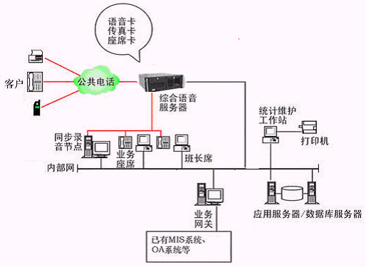 本系統(tǒng)物理結(jié)構(gòu)由帶語音板卡的高性能工控機(jī)(稱為綜合語音服務(wù)器,在功能上可以分為CTI服務(wù)器、IVR(交互式語音應(yīng)答)/IFR服務(wù)器、統(tǒng)計維護(hù)管理工作站、數(shù)據(jù)庫/應(yīng)用服務(wù)器、錄音留言工作站、業(yè)務(wù)網(wǎng)關(guān)服務(wù)器、業(yè)務(wù)代表座席、網(wǎng)絡(luò)系統(tǒng)等和應(yīng)用軟件構(gòu)成。