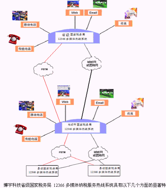 ·系統(tǒng)支持省-市-縣國家稅務局12366多媒體熱線系統(tǒng)的語音和數(shù)據(jù)聯(lián)網(wǎng); 提供完善的組網(wǎng)方案,實現(xiàn)資源共享,統(tǒng)一提供服務。