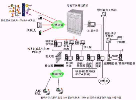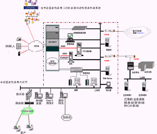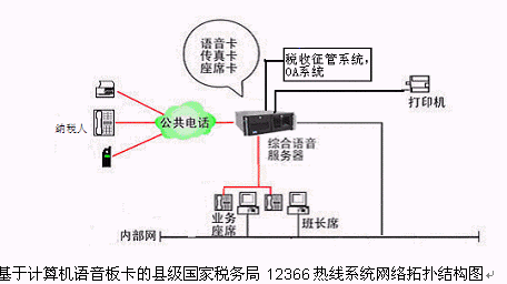對于縣級國家稅務局12366多媒體納稅服務熱線系統(tǒng),則建議使用基于計算機語音板卡的方式,可以減少投資,同時具有良好的系統(tǒng)性能;對于地市級-縣級國家稅務局12366多媒體納稅服務熱線系統(tǒng),可選用排隊交換機作為語音接入設備,以保障系統(tǒng)的高可靠性和穩(wěn)定性;大大提高了系統(tǒng)的適應面。