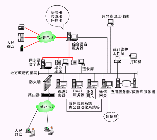 本系統(tǒng)物理結(jié)構(gòu)由帶語音板卡的工控機或排隊交換機、座席分流器、CTI服務(wù)器、IVR(交互式語音應(yīng)答)/IFR(交互式傳真應(yīng)答)服務(wù)器、業(yè)務(wù)代表座席、班長座席、統(tǒng)計維護管理工作站、因特網(wǎng)(WEB)服務(wù)器、電子郵件(EMAIL)服務(wù)器、數(shù)據(jù)庫/應(yīng)用服務(wù)器、業(yè)務(wù)網(wǎng)關(guān)服務(wù)器、錄音留言工作站、領(lǐng)導(dǎo)查詢工作站、網(wǎng)絡(luò)系統(tǒng)等構(gòu)成。