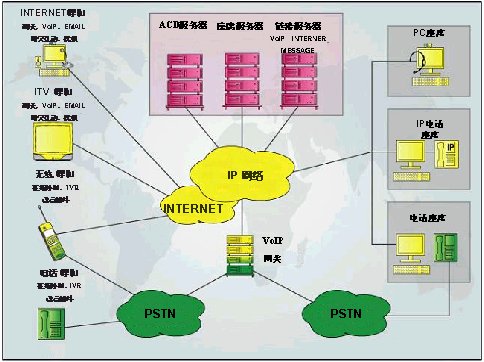 | 集中管理、分布式座席 | 基于IP網(wǎng)絡(luò)、先進(jìn)的ACD、用戶端軟件 |