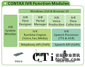 CONTAX IVR 是一個(gè)完整的媒體交換方案,可用于交互式語音應(yīng)答、文字/語音轉(zhuǎn)換、電腦電話語音整合、傳真轉(zhuǎn)遞、自動(dòng)傳真回覆 (FOD)、簡(jiǎn)訊發(fā)送等等……