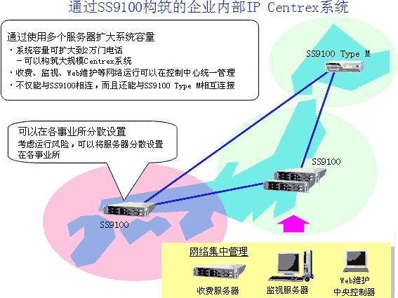 多個(gè)SS9100服務(wù)器相互協(xié)作,擴(kuò)大了系統(tǒng)整體容量。以往模型由1個(gè)服務(wù)器構(gòu)成,系統(tǒng)最大只能容納5千門電話,而SS9100 R5可以構(gòu)筑將系統(tǒng)整體容量擴(kuò)展到容納2萬門電話的大規(guī)模Centrex系統(tǒng)。進(jìn)而,通過將服務(wù)器分散設(shè)置在各事業(yè)所的形式,可以考慮分散各事業(yè)所之間故障危險(xiǎn)的基礎(chǔ)上構(gòu)筑系統(tǒng)。
