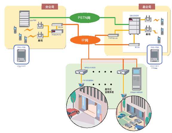 - 可以實現(xiàn)先在各分支機(jī)構(gòu)分散的按鍵電話系統(tǒng)改裝IP群組接入裝置,構(gòu)成分支機(jī)構(gòu)辦公室環(huán)境。