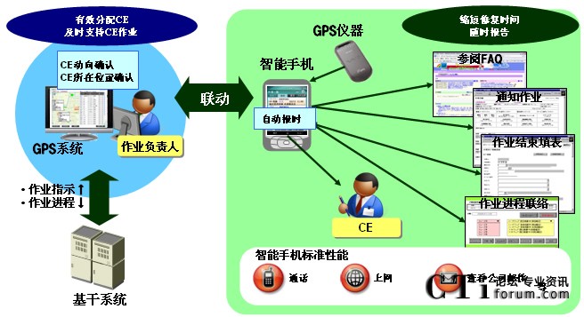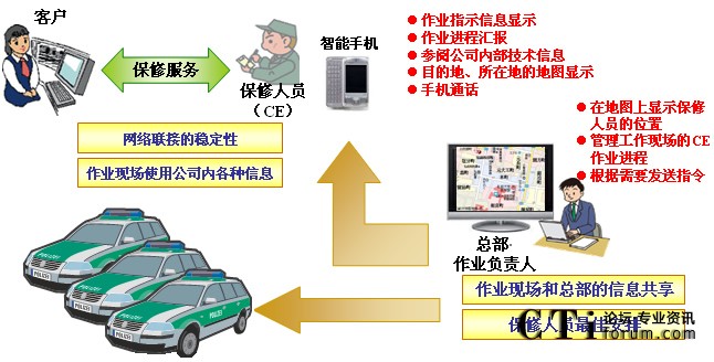“MoBiz AP for CE支持系統(tǒng)”是在支持保修人員在工作現(xiàn)場(chǎng)作業(yè)的同時(shí),實(shí)現(xiàn)總部對(duì)工作現(xiàn)場(chǎng)“可視化”管理的應(yīng)用程序軟件包。