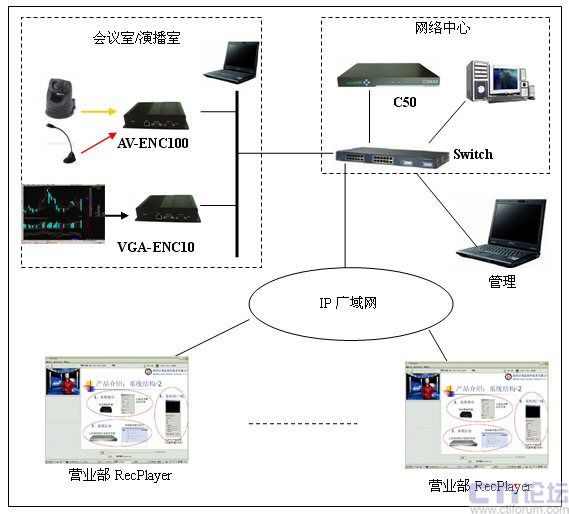 在分析了海通證券的實際需求和網(wǎng)絡環(huán)境以后,決定采用一套DSS-R-C50+來組建整個媒體廣播系統(tǒng)。系統(tǒng)由媒體采集系統(tǒng)AV-ENC100/VGA-ENC100,流媒體處理和錄制系統(tǒng)C50和媒體接收系統(tǒng)RecPlayer組成。通過此系統(tǒng)可以實現(xiàn)語音、視頻和計算機桌面的同步實時直播、錄制和點播。系統(tǒng)的結構圖如下:
