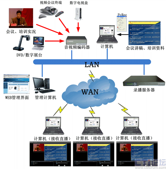 如上圖所示,會(huì)易錄采用前后臺(tái)分離模式,前臺(tái)設(shè)備(視音頻編碼器、數(shù)據(jù)編碼器)負(fù)責(zé)信號(hào)采集;后臺(tái)設(shè)備(多媒體錄播服務(wù)器)負(fù)責(zé)信號(hào)處理。前后臺(tái)設(shè)備之間通過IP網(wǎng)絡(luò)進(jìn)行通訊。上述編碼器可將采集到的視音頻信號(hào)和計(jì)算機(jī)屏幕信號(hào)編碼后通過網(wǎng)絡(luò)發(fā)送到后臺(tái)的多媒體錄播服務(wù)器,多媒體錄播服務(wù)器可將收到的視音頻信號(hào)和計(jì)算機(jī)屏幕信號(hào)進(jìn)行同步一體化的錄制、直播、點(diǎn)播。