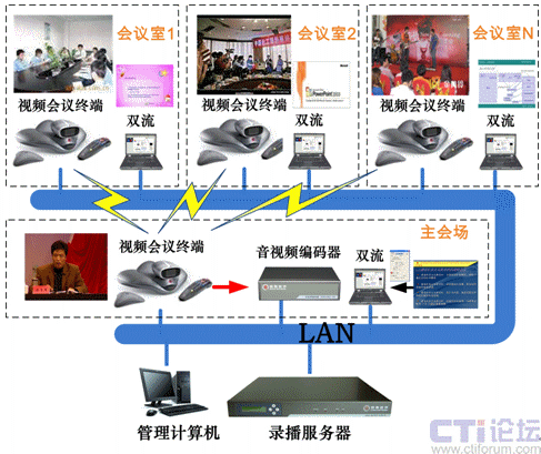 當(dāng)需要錄制沒有錄播的其他會(huì)議室實(shí)況時(shí),通過主會(huì)場(chǎng)視頻會(huì)議終端呼叫任意會(huì)場(chǎng)的終端,即可錄制任意會(huì)場(chǎng)的會(huì)議實(shí)況,如下圖: