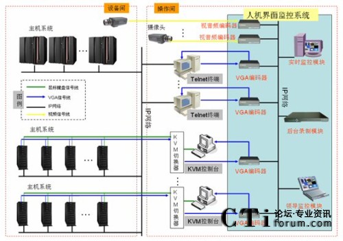 如上圖所示,該機(jī)房分為設(shè)備間和操作間,小型機(jī)等主機(jī)系統(tǒng)安裝在設(shè)備間內(nèi),平時工作人員通常在操作間內(nèi)通過Telnet終端及KVM控制臺等方式訪問主機(jī)系統(tǒng)進(jìn)行操作,這些Telnet終端、KVM控制臺即為機(jī)房內(nèi)人與機(jī)器打交道的“人機(jī)界面”。
