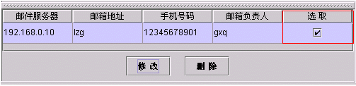 ·修改監(jiān)控郵箱配置時,首先點(diǎn)擊'選取'項(xiàng)中的小方框,選中該列然后雙擊要修改項(xiàng)的內(nèi)容,修改完畢后按下Enter即回車鍵,再點(diǎn)擊修改按鈕