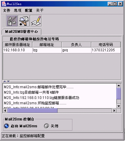 此窗口主要用來顯示Mail2SMS與所監(jiān)控郵箱的連接狀態(tài),及啟動與關(guān)閉Mail2SMS的監(jiān)控功能。如上圖所示點(diǎn)擊