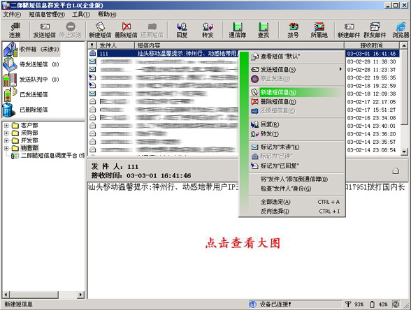 二郎腿短信息群發(fā)平臺(tái)(企業(yè)版)功能強(qiáng)大、界面友好(類似OutLook風(fēng)格,操作簡(jiǎn)單),企業(yè)只需很少的投入就可以建立起自己的短信息群發(fā)中心,通過(guò)該平臺(tái)可以充分利用移動(dòng)通訊公司提供的短信息服務(wù)功能,來(lái)發(fā)布各種行業(yè)相關(guān)信息;如:短信息群組發(fā)送(如:業(yè)務(wù)廣告發(fā)布推廣)、分組發(fā) 送(如:通知各部門(mén)的工作人員 ,在不同的時(shí)間及時(shí)開(kāi)會(huì))、批處理發(fā)送(自動(dòng)給不同收件人,發(fā)送不同短信息 如:工資發(fā)放通知含個(gè)人工作金額)……,還可以做到由用戶來(lái)定制或查詢他所要求的資訊。擁有二郎腿短信息群發(fā)平臺(tái)(企業(yè)版)就等于擁有一個(gè)信息管理及業(yè)務(wù)增值的有效工具。